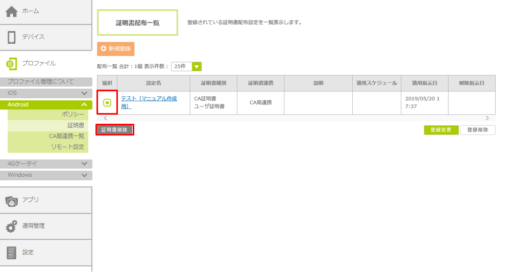 | デバイスから証明書を削除しても、管理サイトに登録した証明書は削除されません。 |
