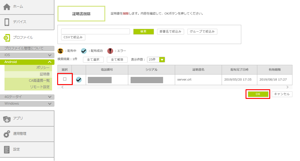 3.証明書を削除したいデバイスを選択し、「OK」ボタンをクリックします。