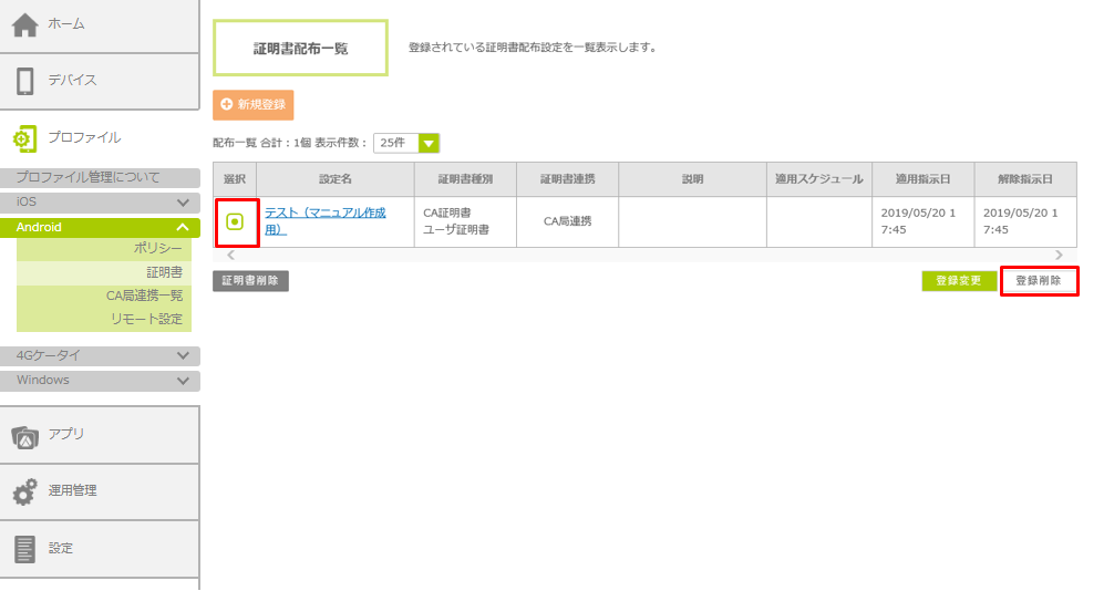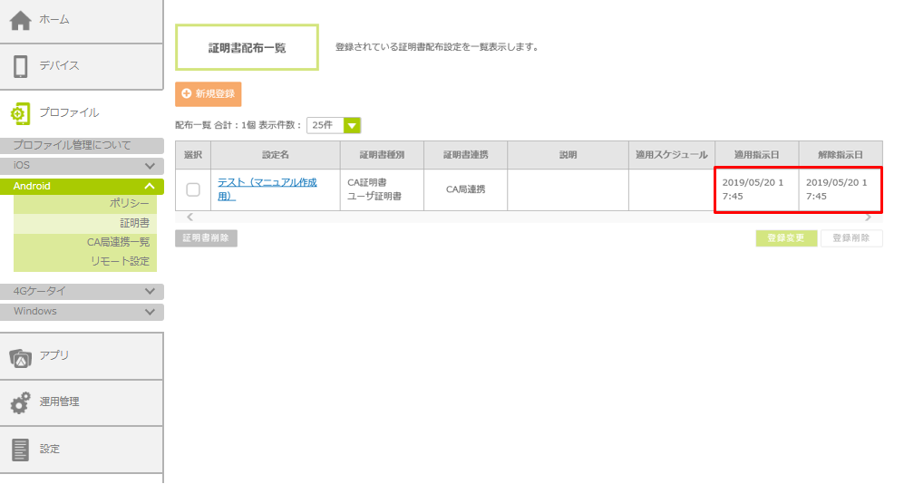 1.「証明書配布一覧」画面で、該当設定名の「適用指示日」および「解除指示日」に、証明書を削除した日時が表示されていることを確認します。