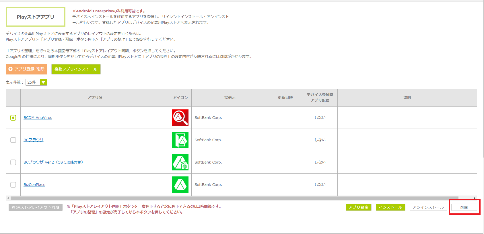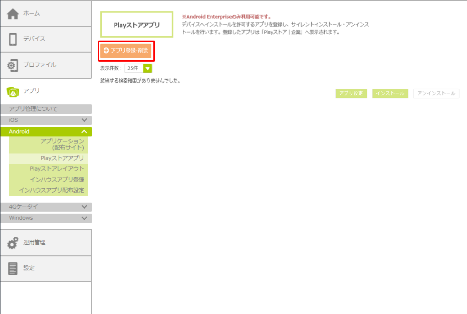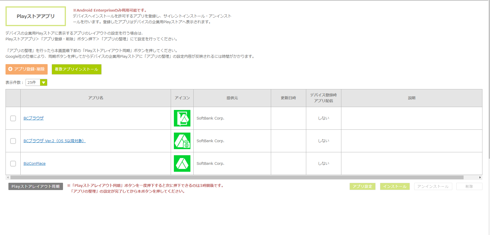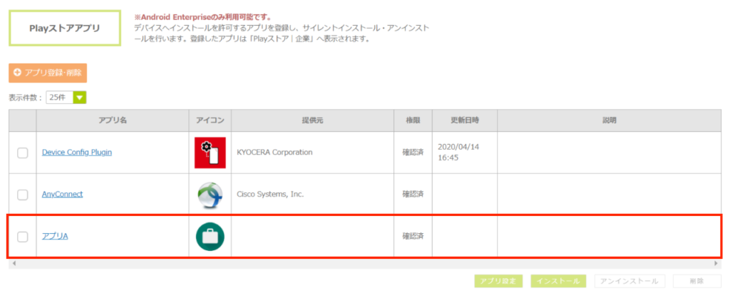 - アプリケーションの仕様により、管理サイトに登録しても、デバイスのPlayストアに表示されなかったり、サイレントインストールがエラーになったりする場合があります。アプリケーションの対応バージョン、機種を確認してください。