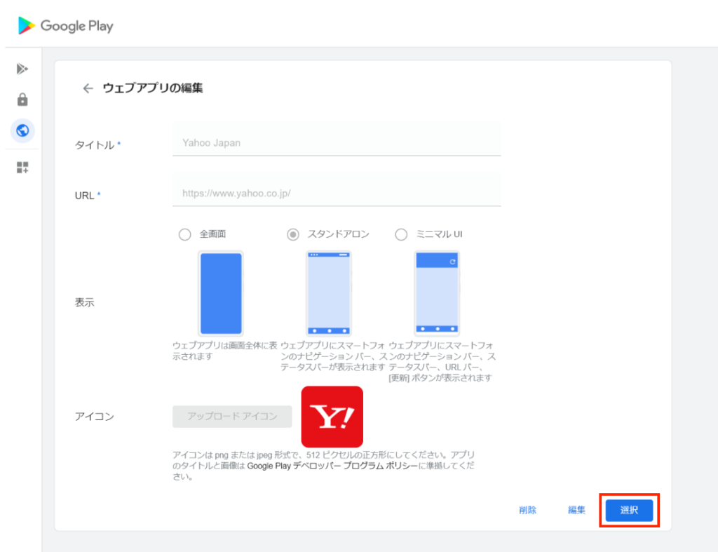 ・「編集」を押下すると当該ウェブアプリを編集することができます。 ・「削除」を押下すると当該ウェブアプリを削除することができます。 |