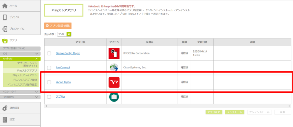 ・事前に、デバイスからアプリケーションをアンインストールしてください。 ・サイレントインストールしたアプリケーションは、管理サイトからサイレントアンインストールすることができます。サイレントアンインストールの方法は、「4.9.2. Playストアアプリをサイレントインストールする」を参照してください。 |