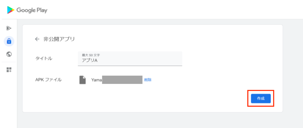 6.非公開アプリをアップロードし「作成」ボタンを押下します。