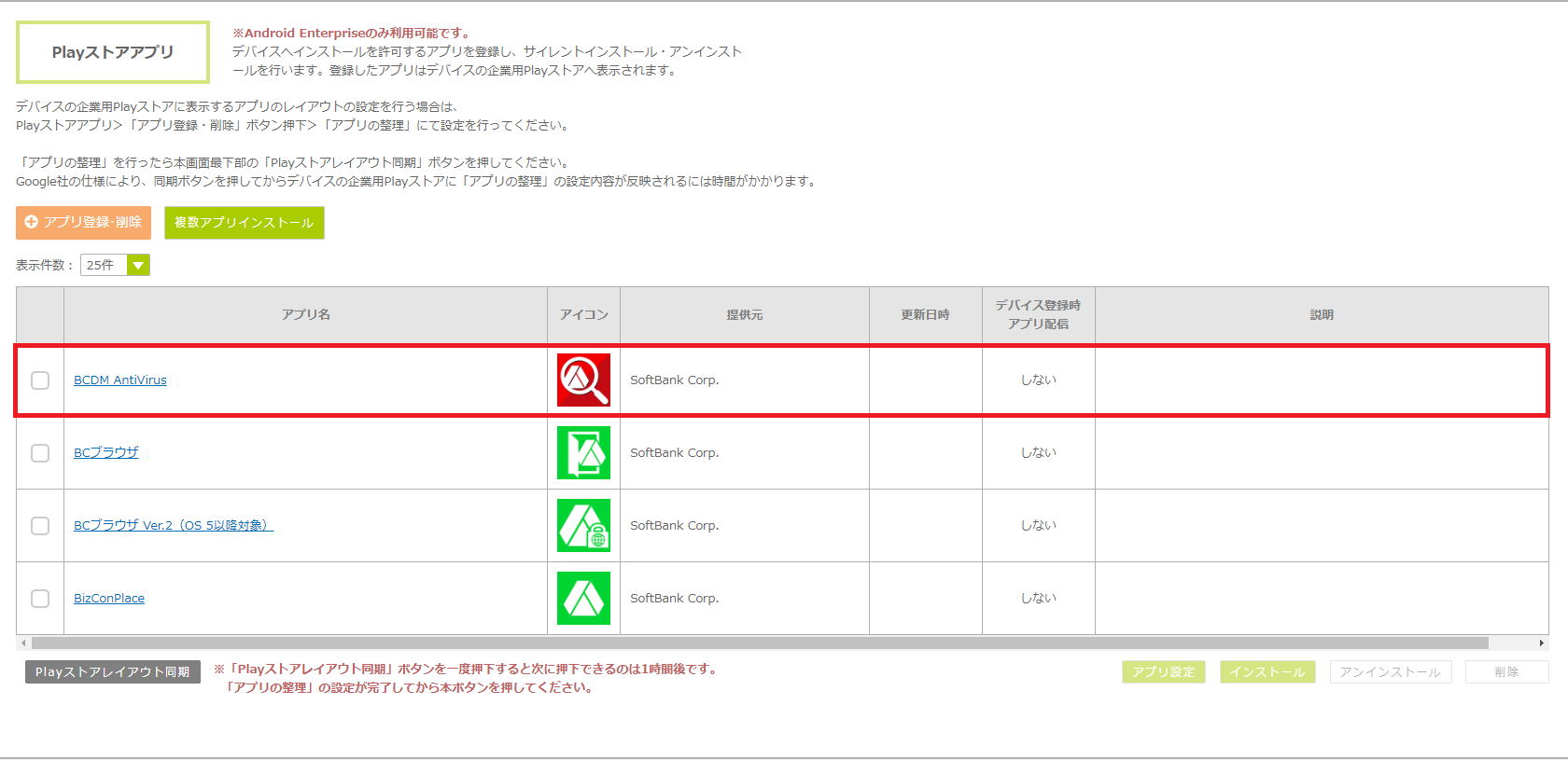 ・「Playストアアプリ」画面にアプリケーションが表示されない場合は、管理サイトに登録が反映されていない可能性があります。手順1.~4.を再度実行してください。