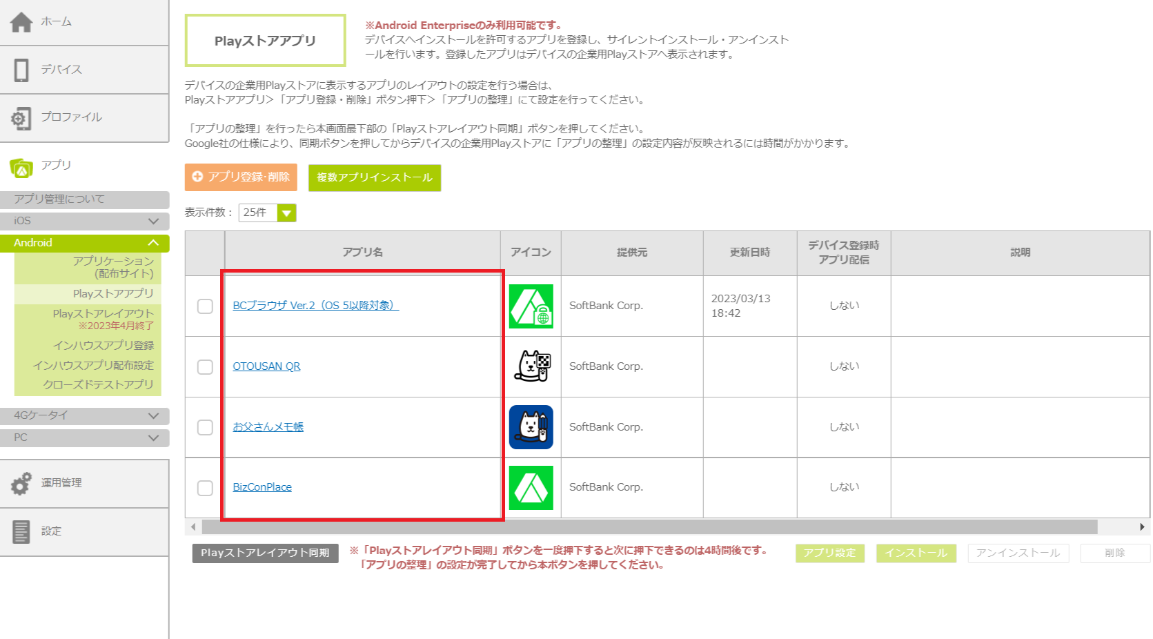 配布するPlayストアアプリは、事前に登録しておく必要があります。
