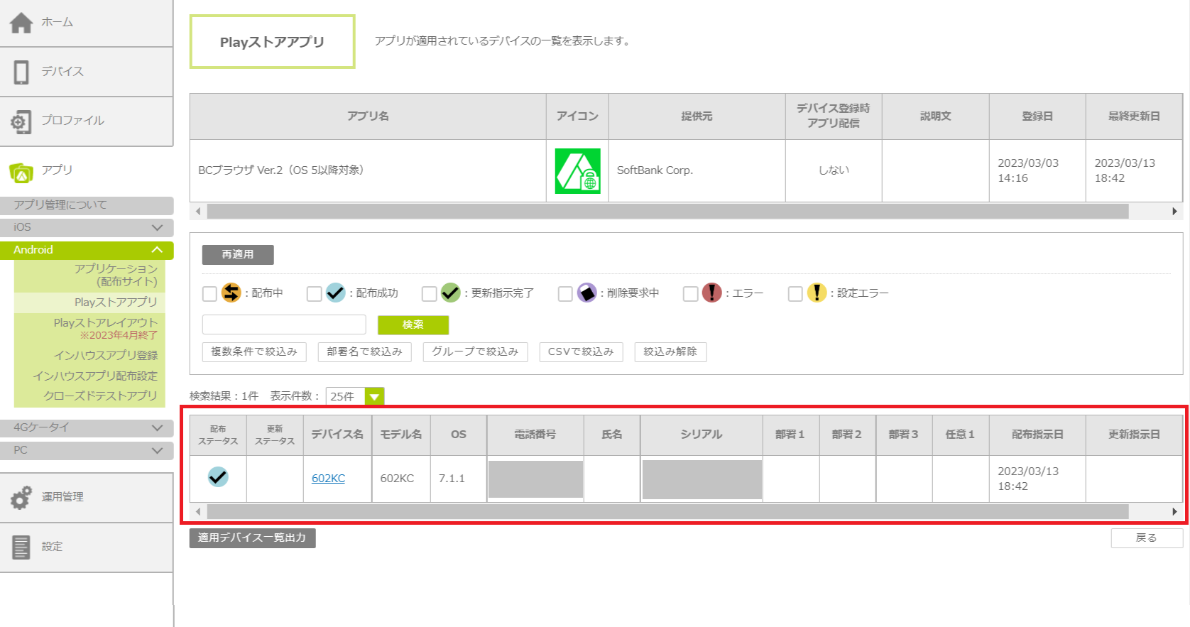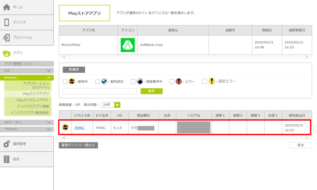 6.該当デバイスのステータスアイコンが「配布中」になっていることを確認します。