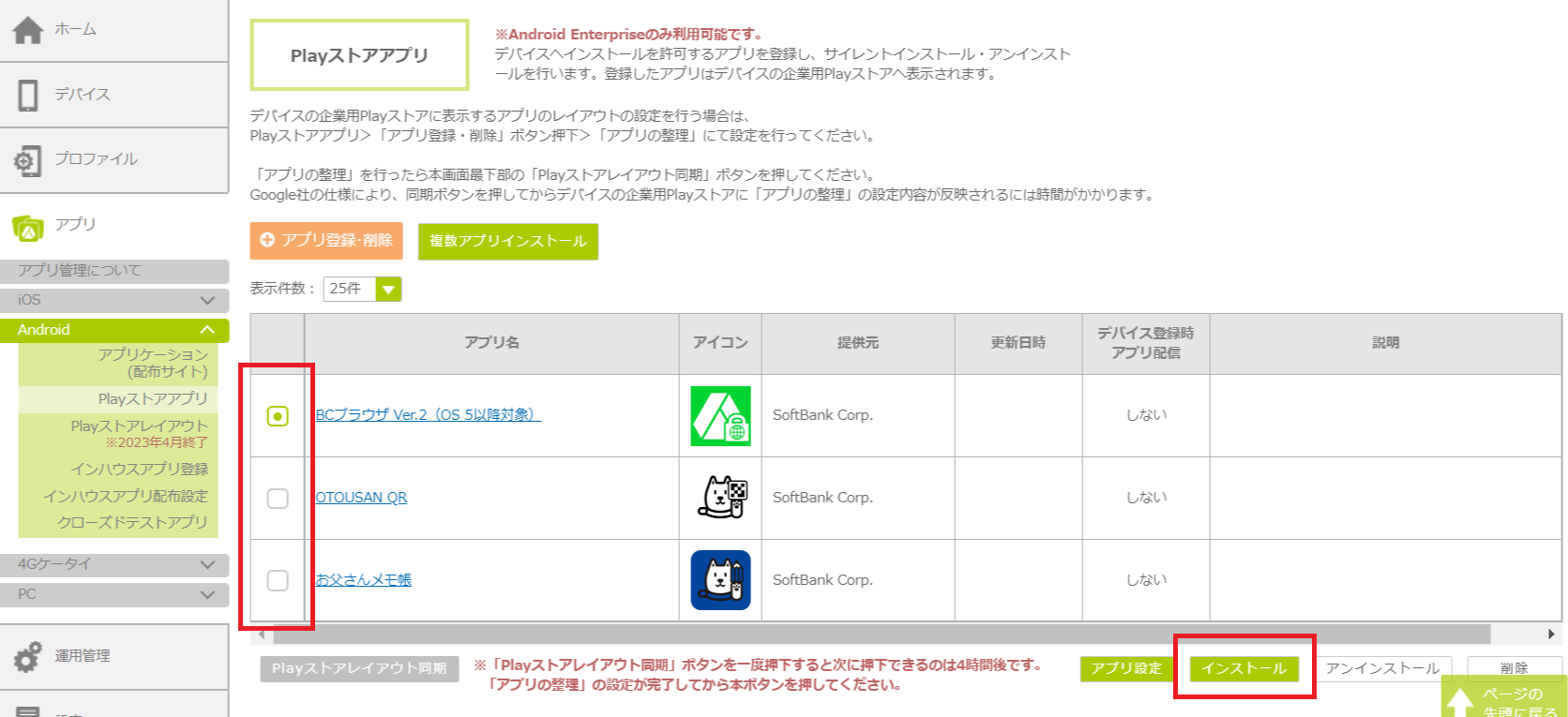 ・管理サイトからサイレントインストールしたアプリを利用者が手動でアンインストールした場合、Google社の仕様により24時間以内に自動でサイレントインストールが実行されます。
