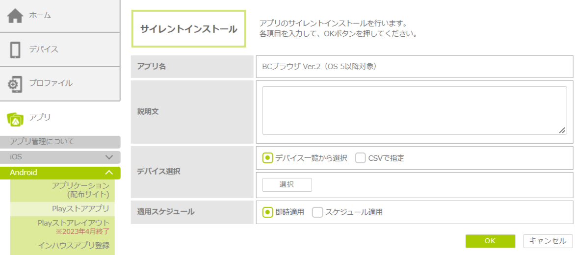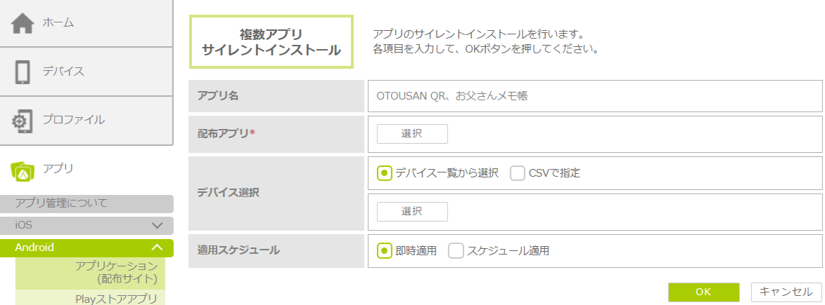 適用スケジュール アプリのインストールをいつ適用するかを選択します。「スケジュール適用」を選択すると、適用の日時を指定できます。