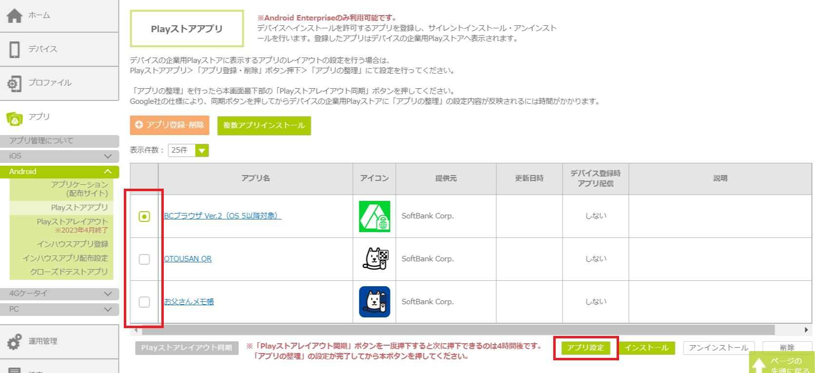 2.デバイス登録時にインストールしたいアプリを選択し、「アプリ設定」ボタンをクリックします。