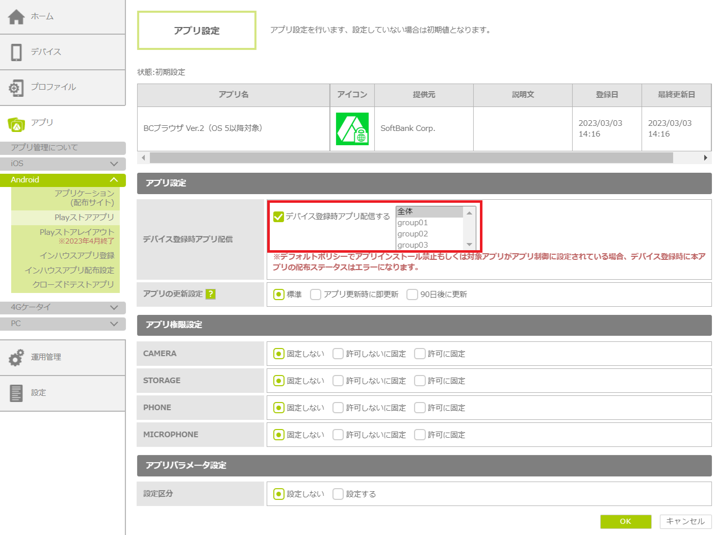 3. 「デバイス登録時アプリ配信する」にチェックを付けて、アプリの配信先を選択します。