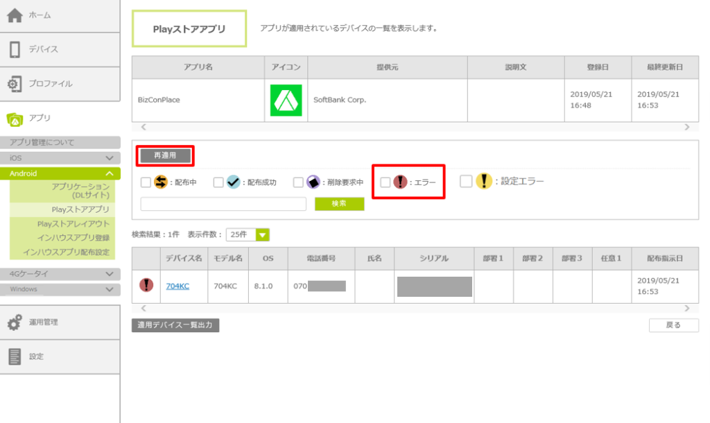 エラーなどによってサイレントインストールが完了しなかった場合は、デバイスに該当アプリのインストールを再適用します。