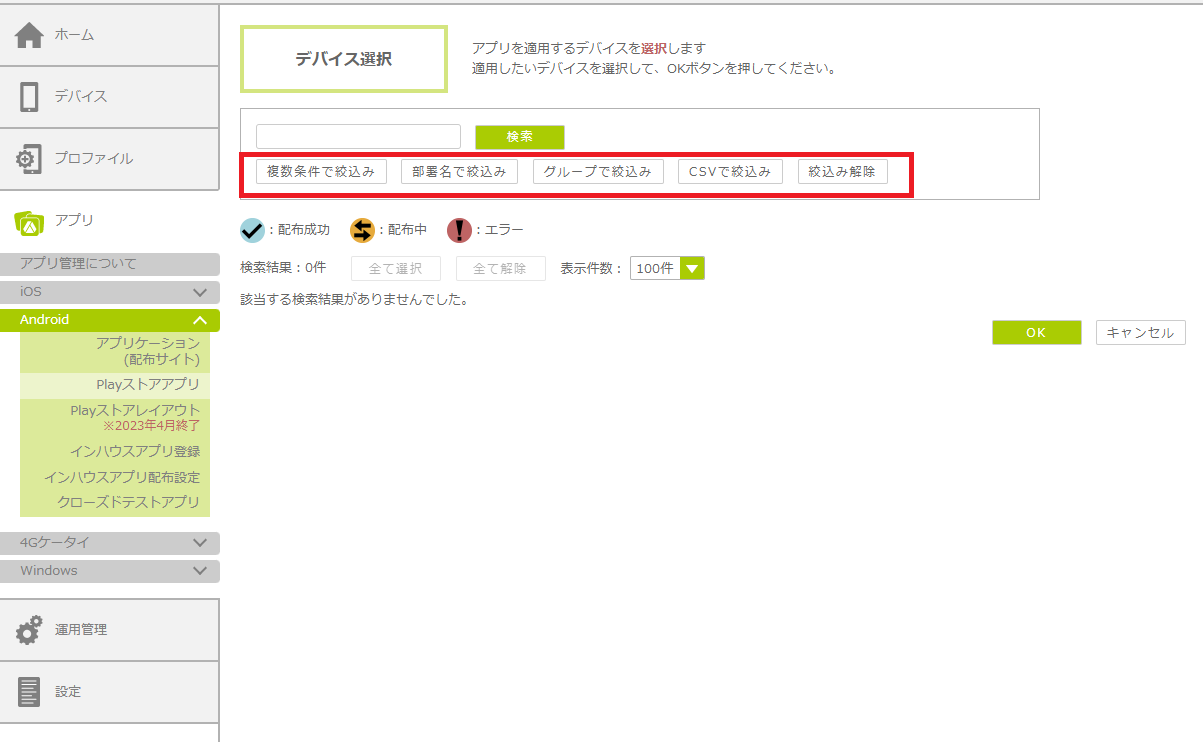 デバイス選択 アプリをインストールするデバイスを選択します。デバイス一覧から選択するか、CSVファイルで指定します。