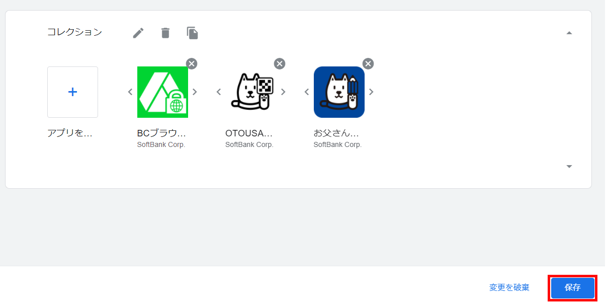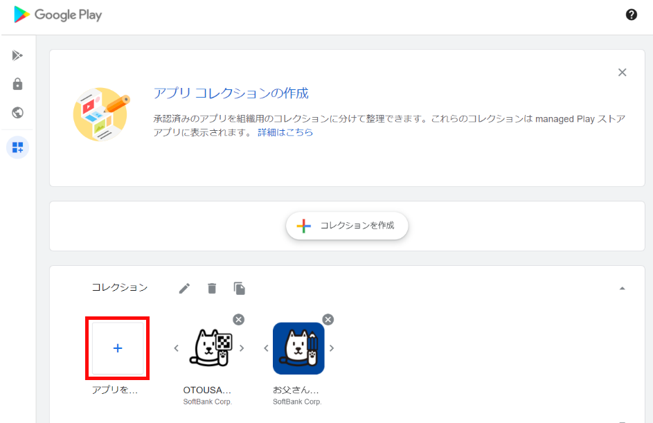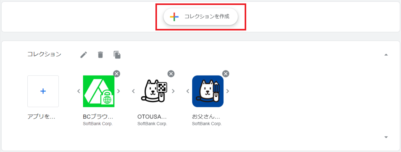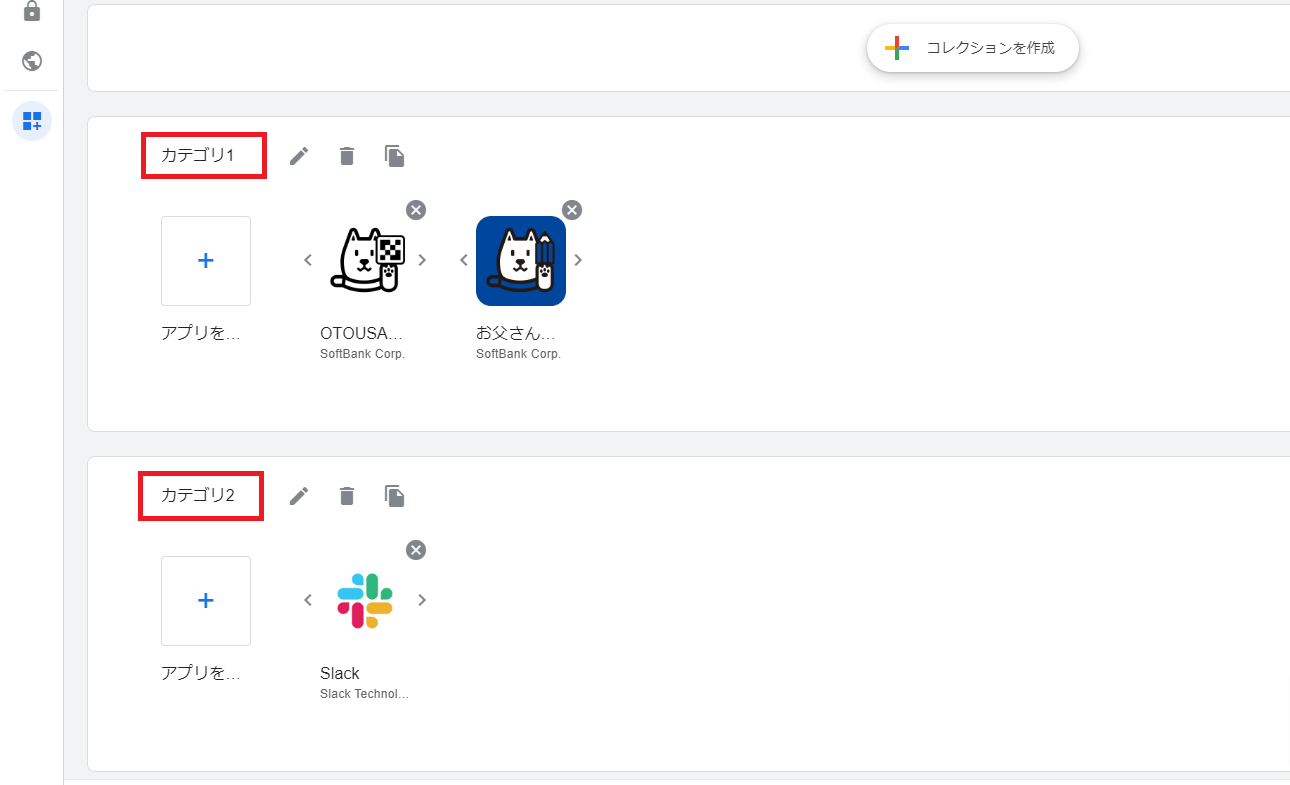 ・「Google Play画面」で「+コレクションを作成」をクリックすると、「カテゴリ」設定を追加することができます。