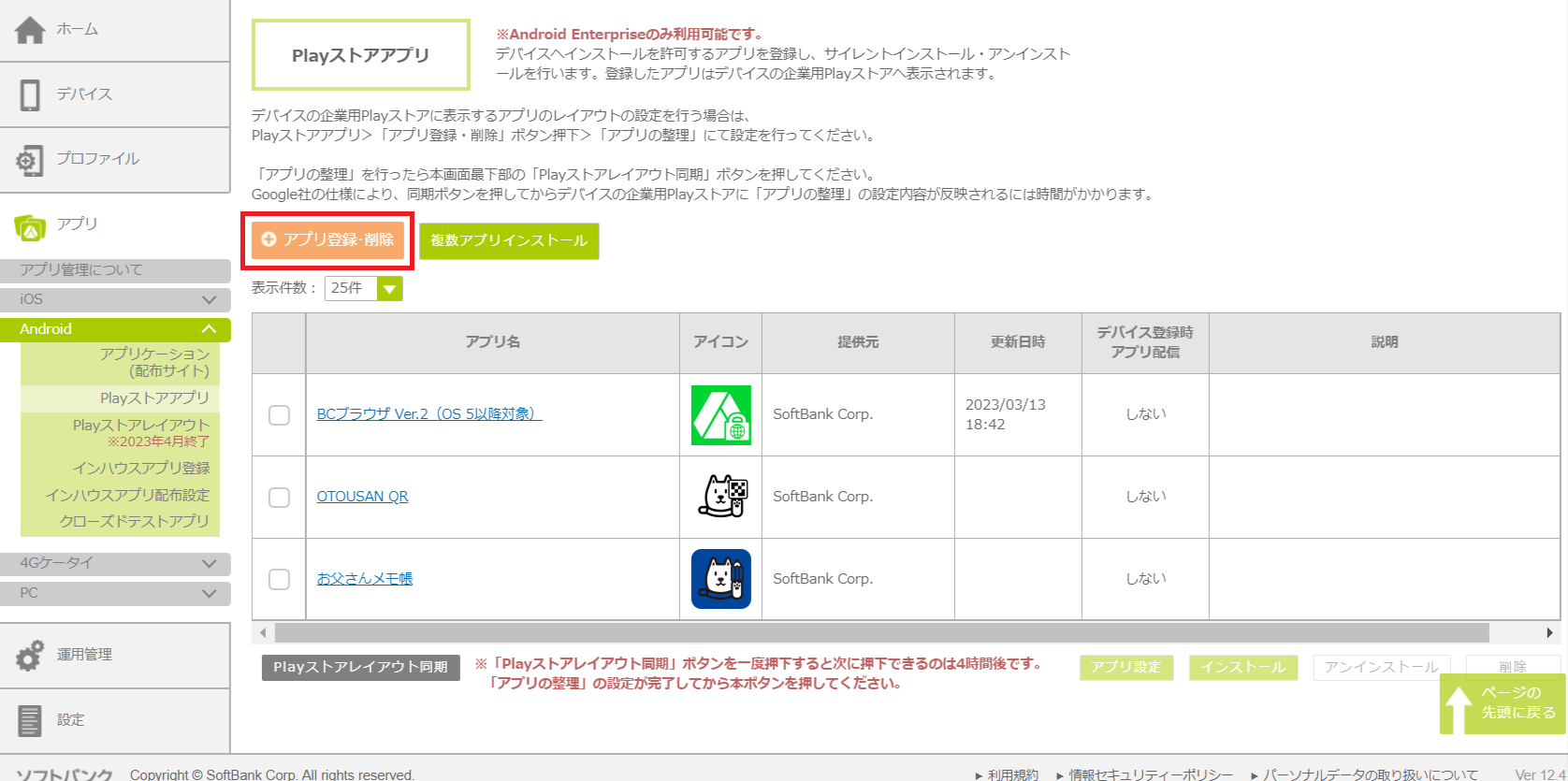 1.「アプリ」をクリックし、「Android」-「Playストアアプリ」の順にクリックし、「アプリ登録・削除」をクリックします。