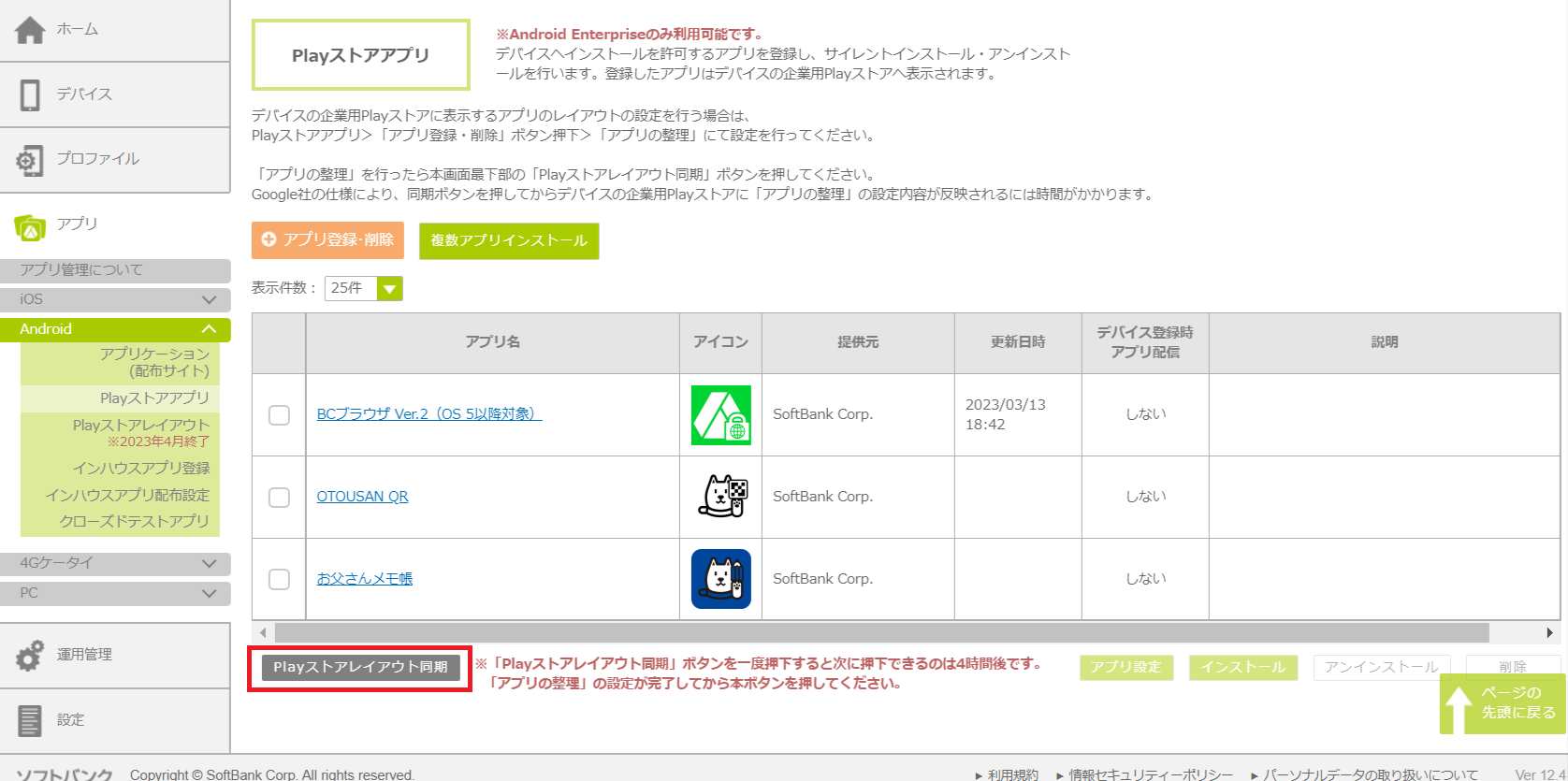 ・ボタン押下後からデバイス反映までの間にレイアウトを変更しても変更した設定は反映されません。4時間後にボタン押下可能になり次第、再度「Playストアレイアウト同期」ボタンを押下してください。