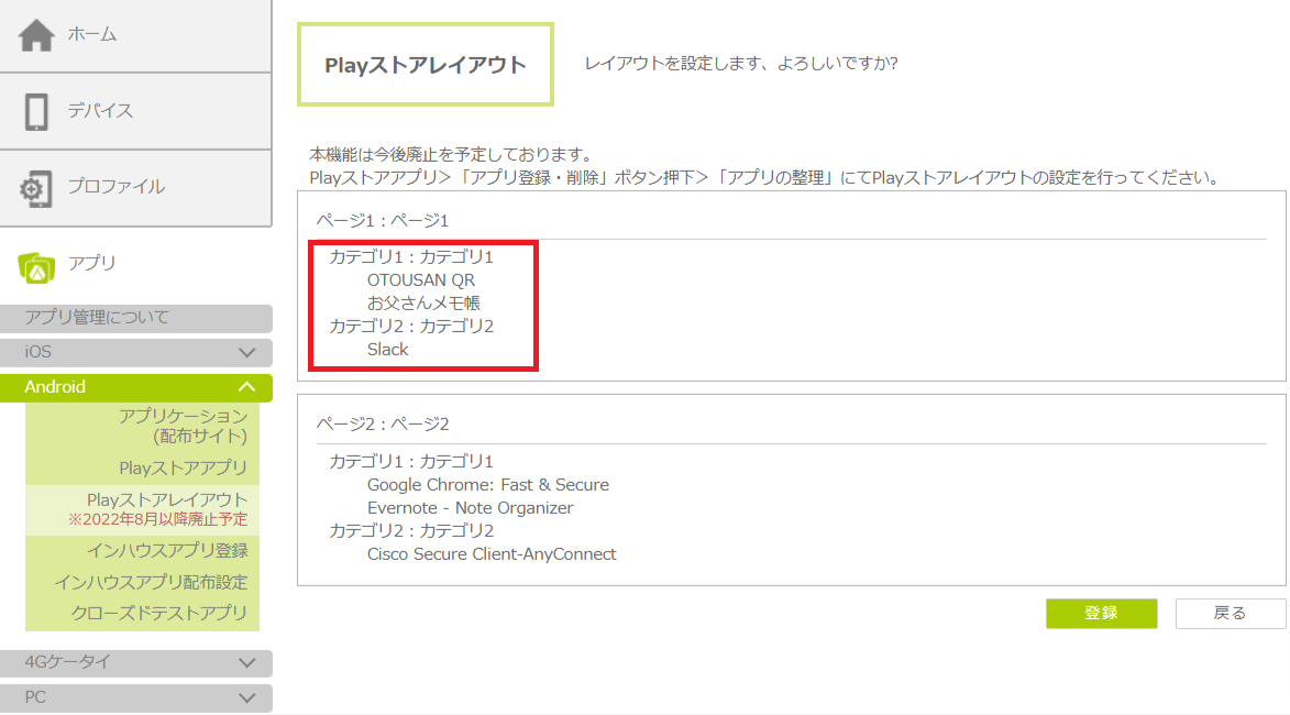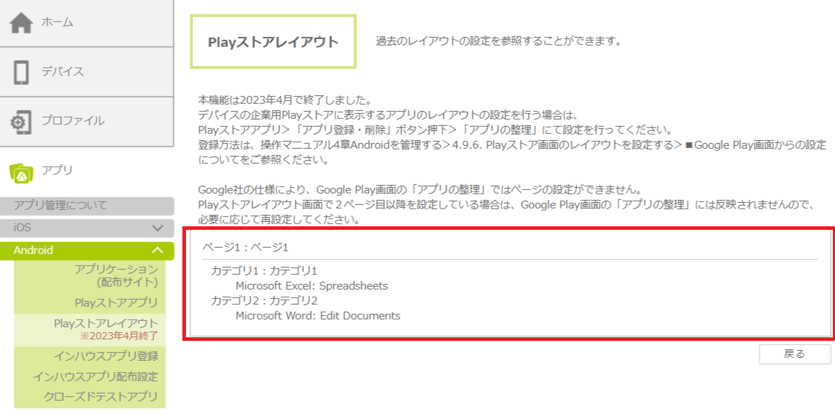 ・「Google Play画面」のレイアウト設定にはページの設定が反映されません。そのため、過去に管理サイトの「Playストアレイアウト」画面で「ページ」を設定していた場合、「Google Play画面」で設定した画面には「ページ1」の「カテゴリ」設定は反映されますが、「ページ2」以降は反映されません。
