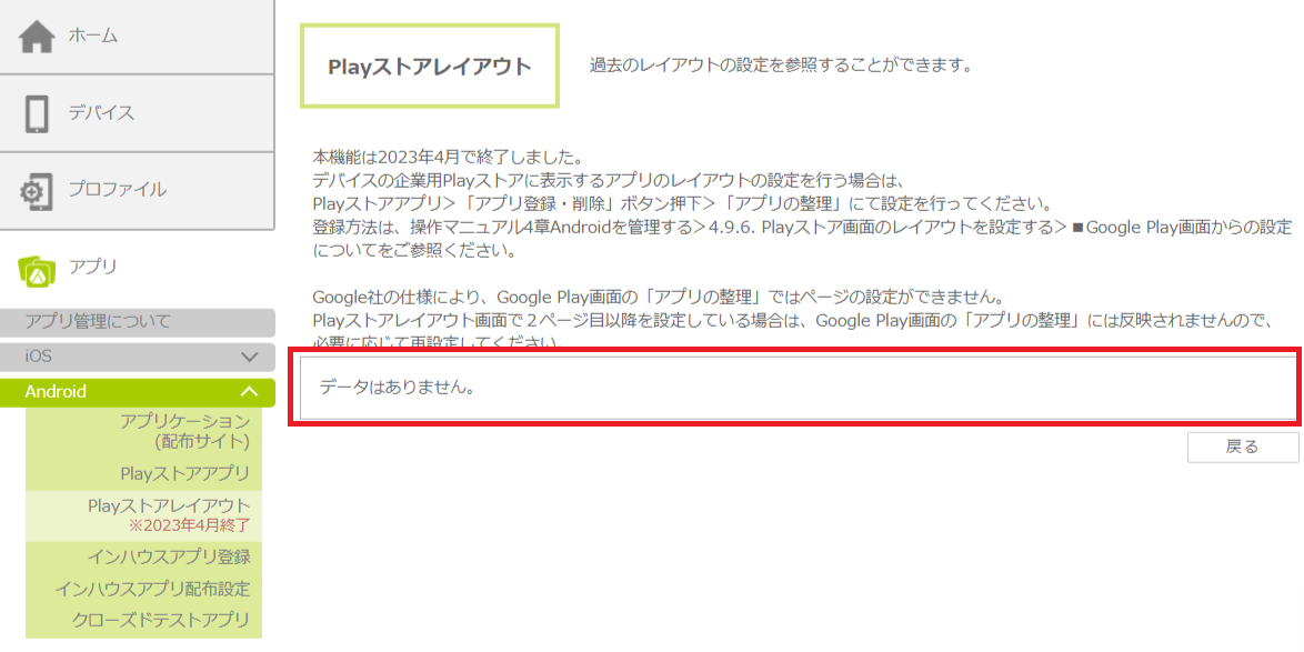 • 過去に「Playストアレイアウト」画面から設定をしていない場合は、「データはありません。」と表示されます。
