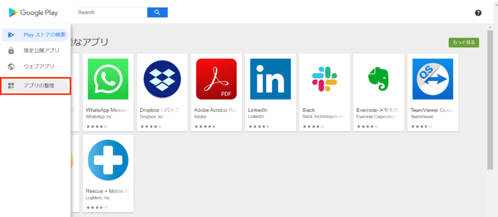2.「Google Play」の画面より、左側のメニュー欄から「アプリの整理」をクリックします。
