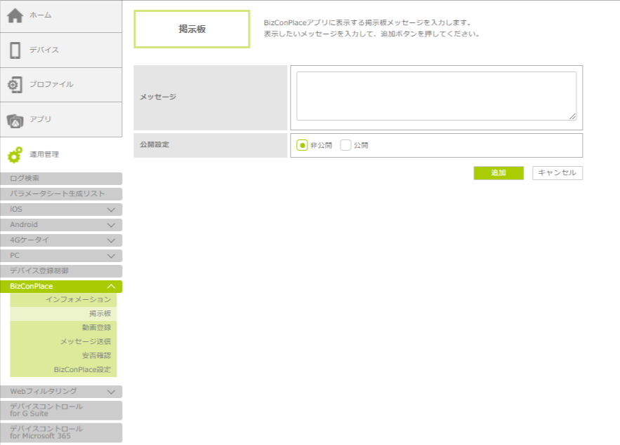 メッセージ BizConPlace/ArrowPortalの掲示板に表示するテキストを入力します。