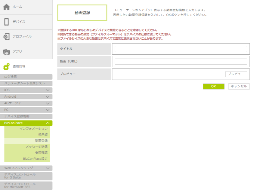 1. 「運用管理」をクリックし、「BizConPlace」-「動画登録」の順にクリックします。