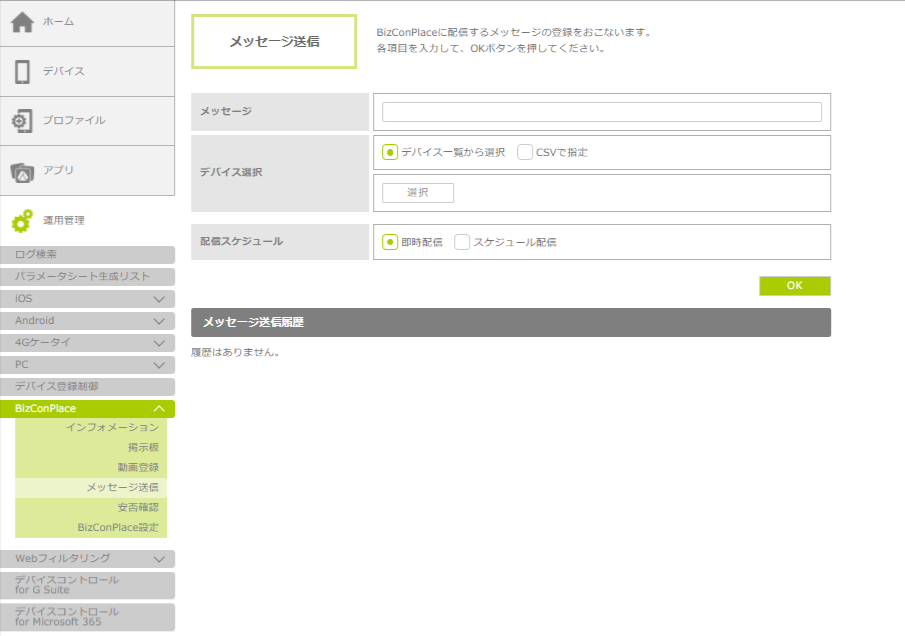 1. 「運用管理」をクリックし、「BizConPlace」-「メッセージ送信」の順にクリックします。