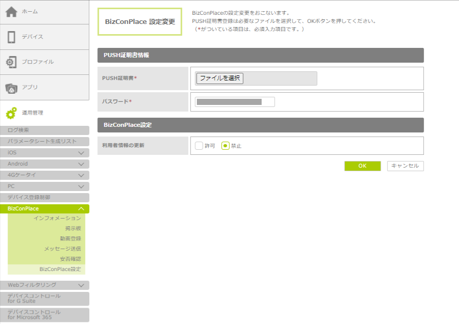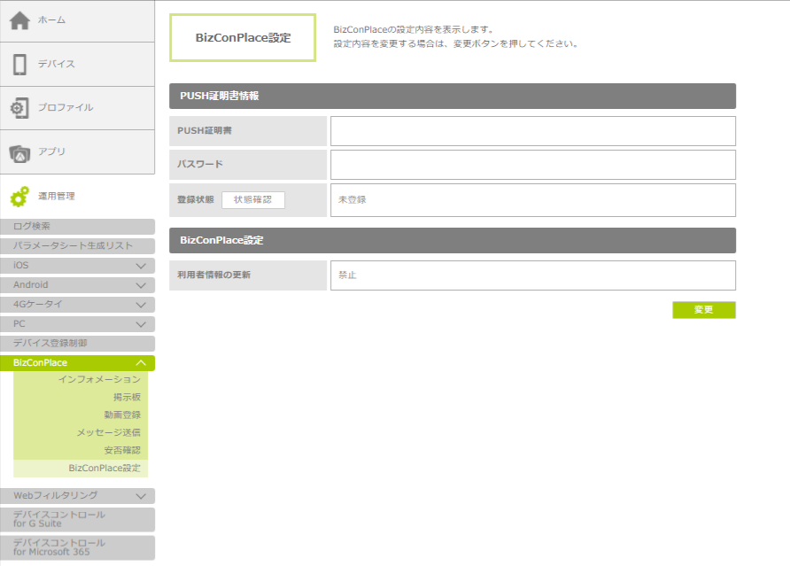 ・本画面でPush証明書情報の登録を行うこともできます。操作方法の詳細については、別途資料を参照してください。 ・デバイス側での利用者情報の編集方法については、「8.5.2. BizConPlace/ArrowPortalを使う」>「利用者情報の編集」を参照してください。 |