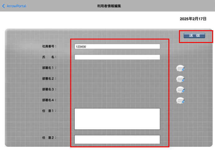 管理者が編集を許可している場合は、利用者が社員番号、氏名、部署名1~4、任意1~4の情報を編集できます。
