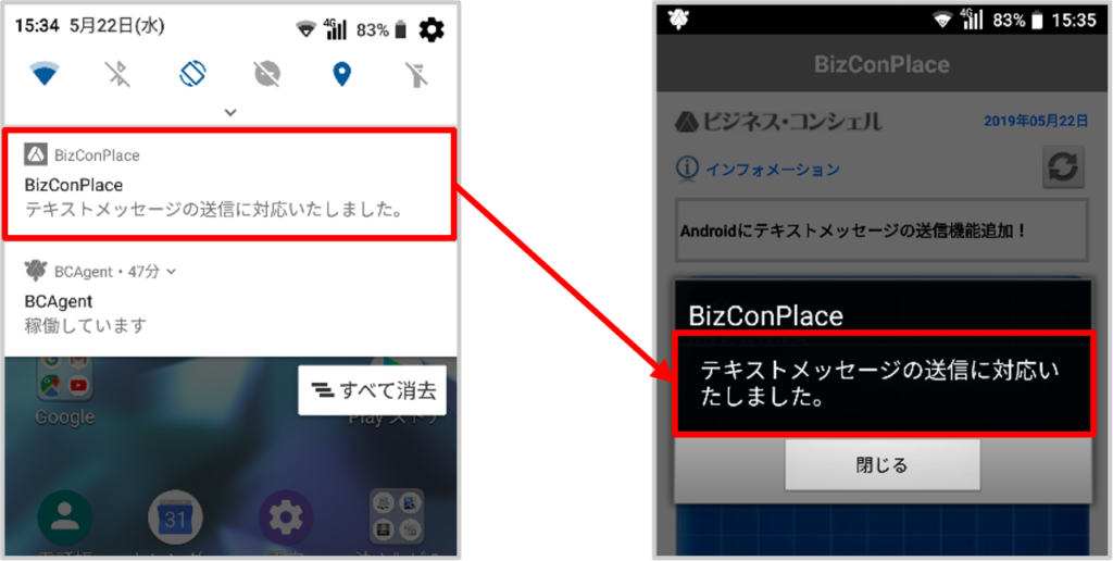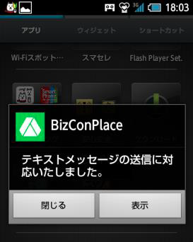 ステータスバーを下にスクロールし、「通知」に表示されたBizConPlaceをタップすると、BizConPlaceが起動してメッセージ全文がダイアログで表示されます。