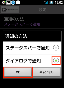 4. 「ダイアログで通知」を選択して「OK」ボタンをタップします。