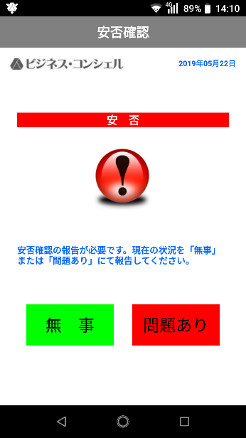 「無事」または「問題あり」ボタンをタップすると、管理サイトに状況が送信され、通常のメイン画面が表示されます。