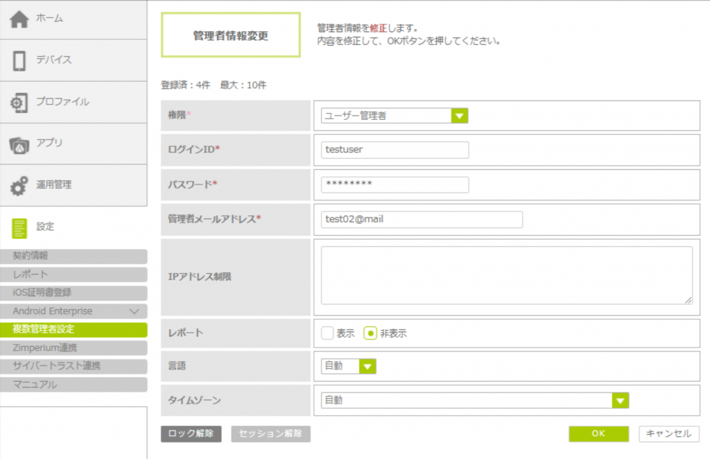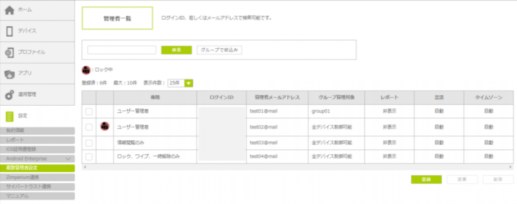 アカウントにロックがかかってログインができない状態になった場合は、「管理者一覧」画面からアカウントのロック解除やセッション解除を行うことでログインが可 になります。