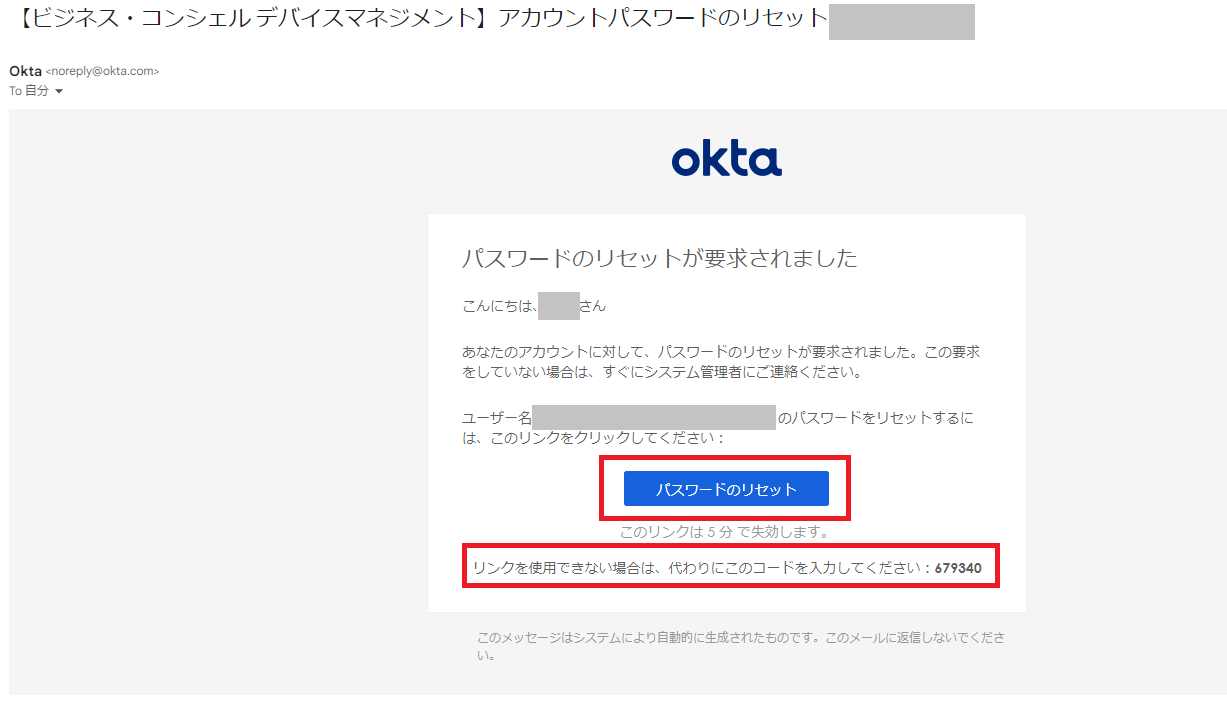 届いたメールの「パスワードのリセット」ボタンをクリックまたは、記載されてるコードを管理サイトに入力してください。