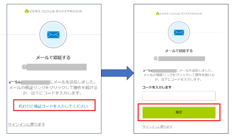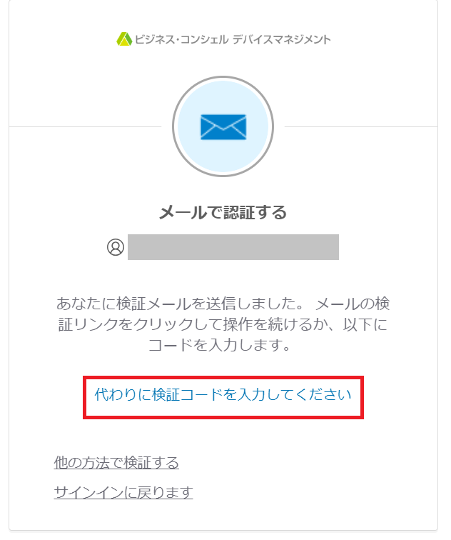 「メールを送信する」ボタンをクリック後に「メールで認証する」画面が表示されます。「代わりに検証コードを入力してください」をクリックし、メールに記載されているコードを入力してください。