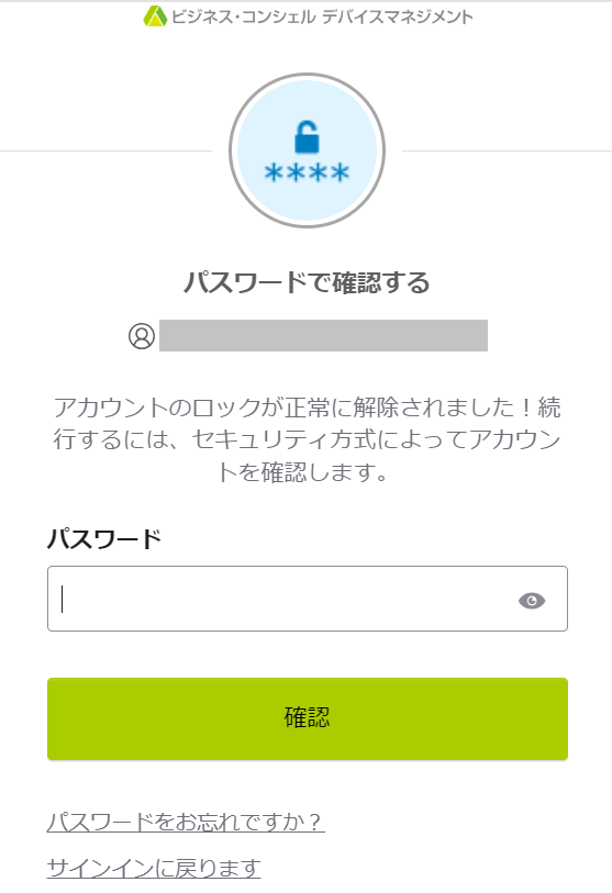 「パスワードポリシー詳細」にて「ユーザーロックアウトまでのログイン失敗回数」を設定している場合、パスワード入力時に設定回数を超えてログインに失敗するとアカウントにロックがかかってサインインができなくなります。