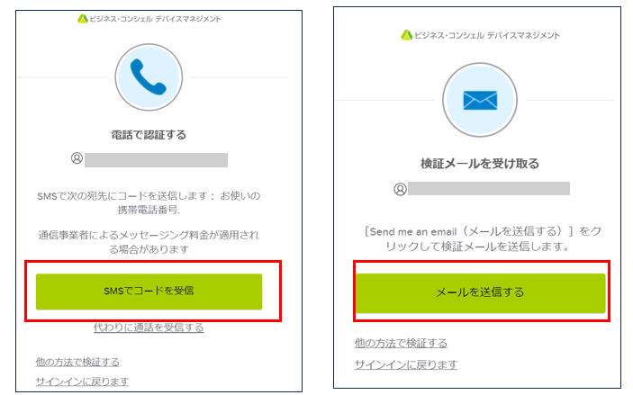 | ・初回ログイン時に電話をセットアップしている場合、メールまたは電話(SMS)どちらかを選択することができます。 |