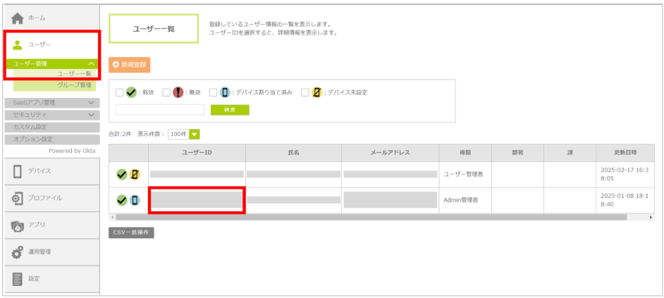 2.「ユーザー」 – 「ユーザー管理」 – 「ユーザー一覧」からアカウントがロックされたユーザーIDを押下します。