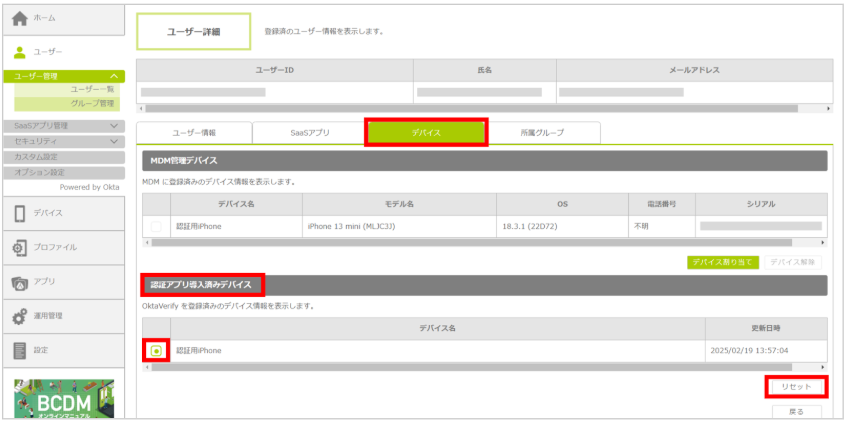 2.デバイス(タブ)の「認証アプリ導入済みデバイス」からOkta Verifyを設定したデバイスを選択し、「リセット」をクリックします。