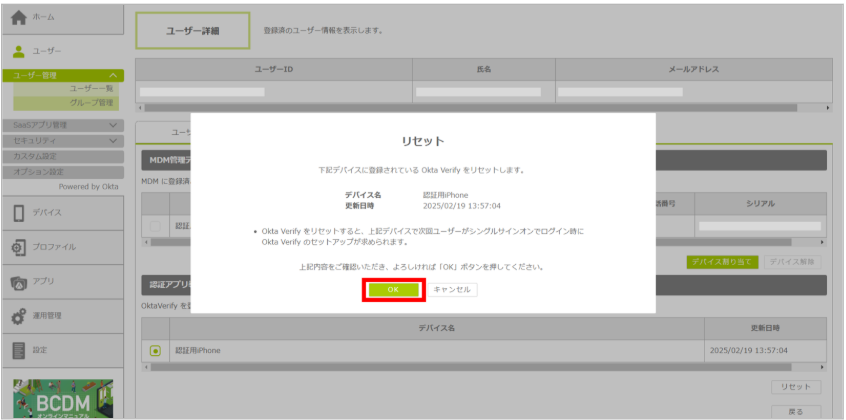 ユーザーと Okta Verify 登録済みデバイスの紐づけをリセットします。
