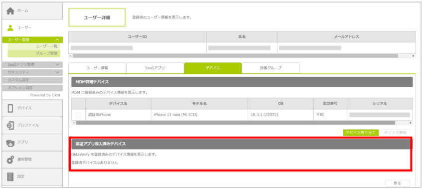 1.「Okta Verify」アプリを設定したユーザー詳細を開きます。