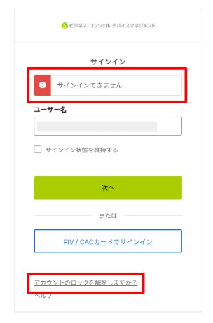 ・アカウントがロックされている場合、「ユーザー名」を入力し、「次へ」を押下すると「サインインできません」と表示されます。