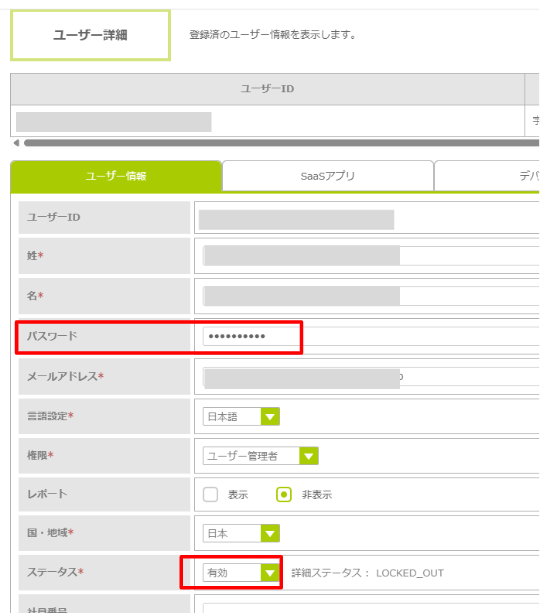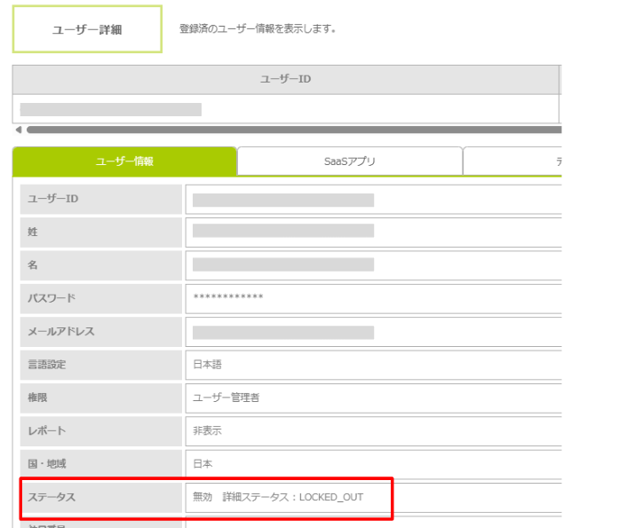 「ユーザー情報」タブの「ステータス」が「無効 詳細ステータス : LOCKED_OUT」と表示されています。
