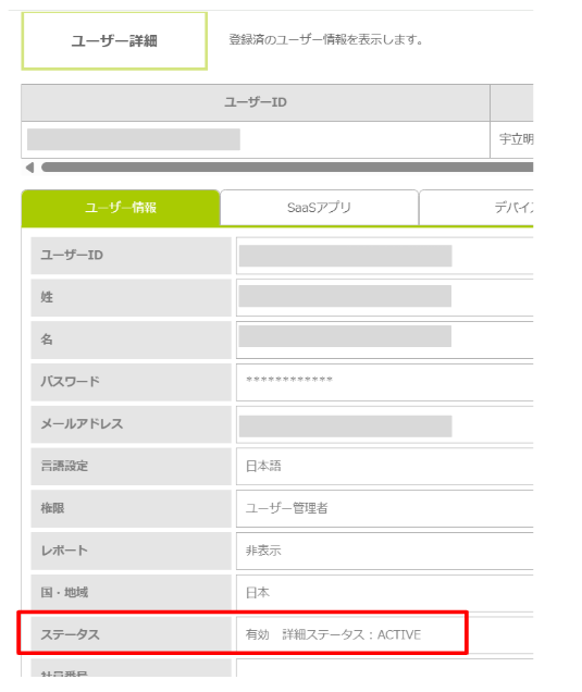 「ステータス」が「有効 詳細ステータス : ACTIVE」に変更され、アカウントのロックが解除されます。