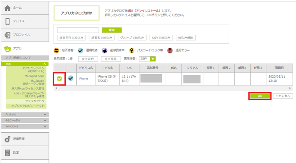 3. アプリカタログをアンインストールするデバイスを選択し、「OK」ボタンをクリックします。