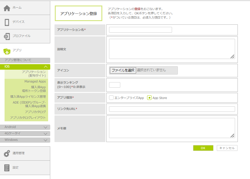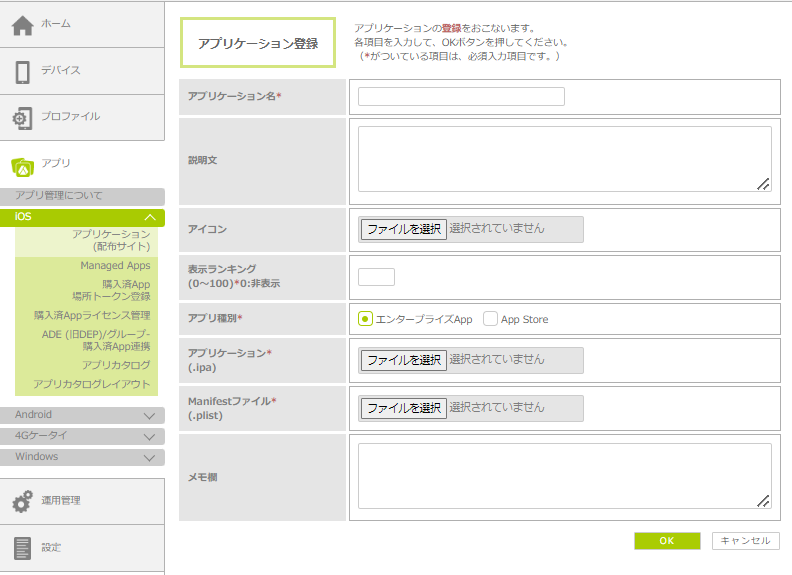 配布するアプリケーションを管理サイトに登録し、アプリ配布サイトに表示します。アプリケーションの種別によって、登録時の設定項目が異なります。