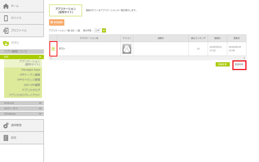 2. 登録削除したいアプリを選択し、「登録削除」ボタンをクリックします。