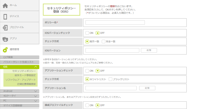 「セキュリティポリシー登録(iOS)」画面が表示されます。