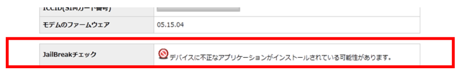 また、BizConPlaceまたはArrowPortalの起動時にJailBreakを検知すると、「不正なアプリがインストールされている可能性があります。管理者へ確認してください。」と表示され、検知した結果は以下のように管理サイトに表示されます。