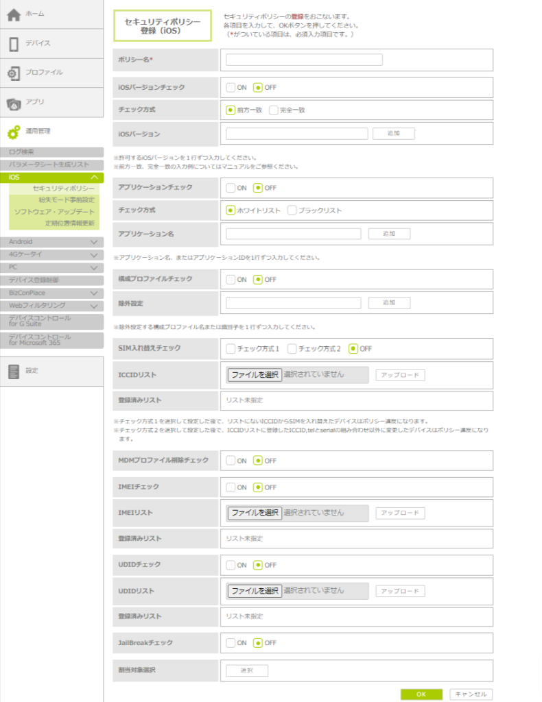 | iOSバージョンチェック | iOSバージョンチェックを行う場合は、「ON」を選択します。 初期設定は「OFF」(チェックしない)になっています。 |