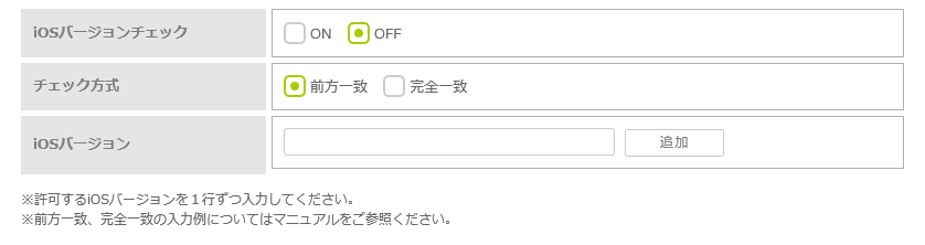 | チェック方式 | 「iOSバージョンチェック」を「ON」に設定した場合は、iOSバージョンのチェック方式を「前方一致」または「完全一致」から選択します。 |