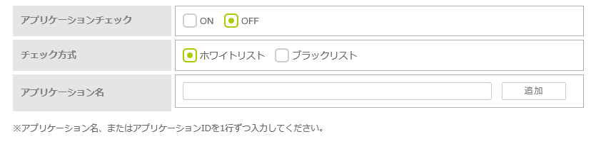 | アプリチェック | アプリチェックを行う場合は、「ON」を選択します。 初期設定は「OFF」(チェックしない)になっています。 |